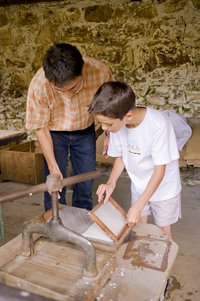 A l’ère d’Internet et des SMS, nous nous replongeons quelques siècles en arrière, à l’origine de la fabrication du papier. Nous faisons découvrir à nos deux enfants la magie de la fabrication d’une feuille de papier à la main, fabrication d’autant plus magique qu’elle se fait grâce à de vieux chiffons...